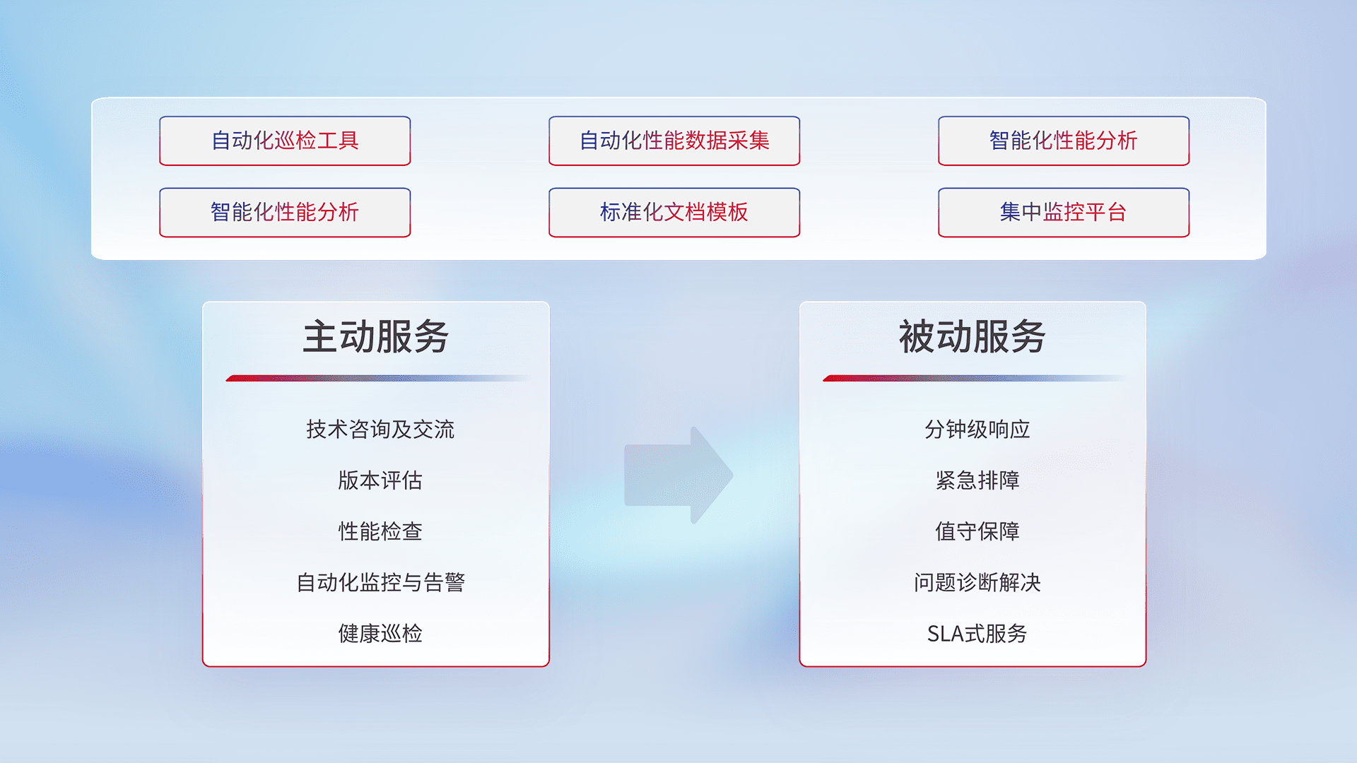 智能化工具和标准化文档,,保障服务质量,,提供主动服务(包含技术咨询、、、版本评估、、、性能检查、、、自动化监控与告警、、、、健康巡检)和被动服务包含(分钟级响应、、、紧急排障、、、、值守保障、、问题诊断解决、、SLA服务)。。。