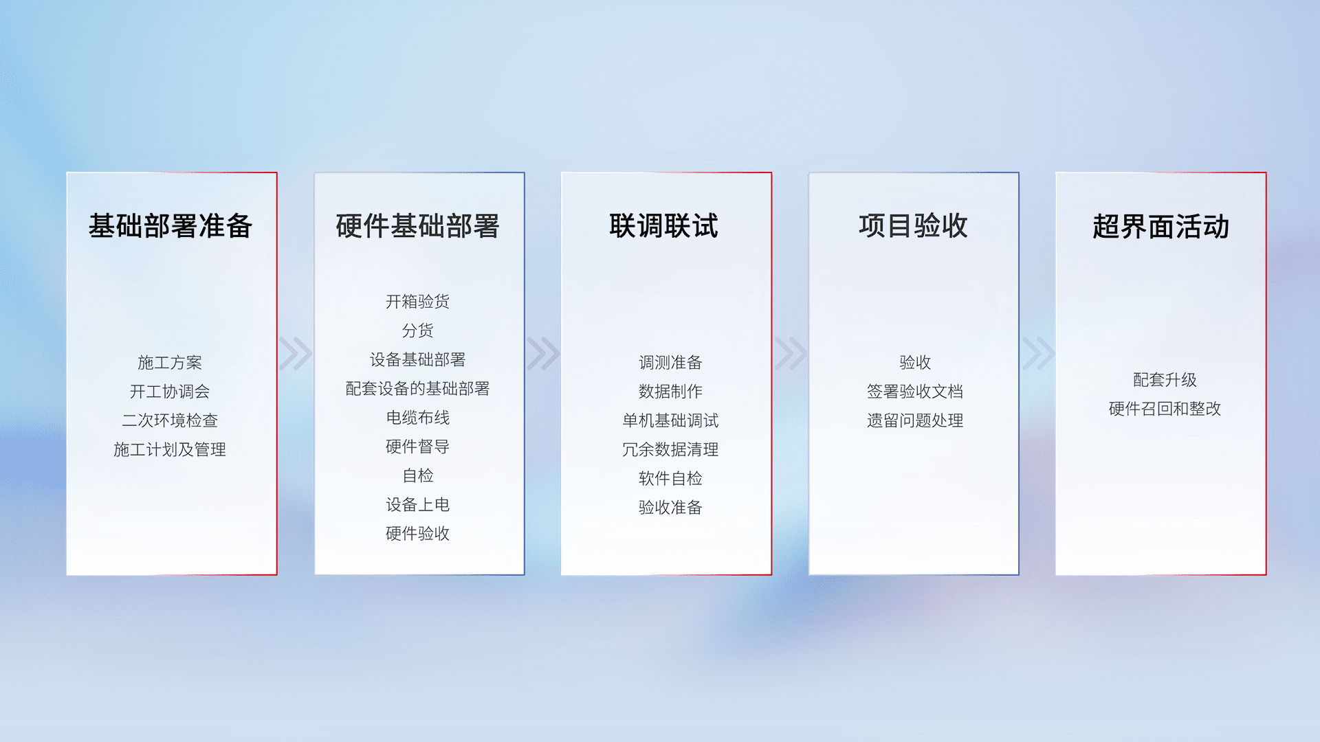 从基础部署准备、、硬件基础部署、、联调联试、、项目验收、、越界面活动的全过程可追溯,,,保证施工质量和进度。。。。